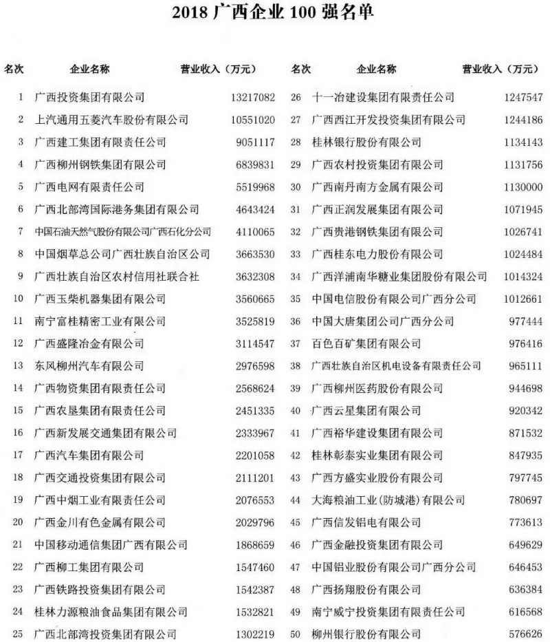 大會揭曉了2018年廣西企業(yè)100強(qiáng),以及廣西民營企業(yè)50強(qiáng)榜單。廣西投資集團(tuán)有限公司、上汽通用五菱汽車股份有限公司、廣西建工集團(tuán)有限公司位列廣西企業(yè)100強(qiáng)榜單前三甲。廣西華業(yè)集團(tuán)旗下子公司廣西華業(yè)建筑工程有限公司以營業(yè)收入41.9億元,位列廣西百強(qiáng)企業(yè)第57名,并躋身廣西民營企業(yè)50強(qiáng)第15強(qiáng)。