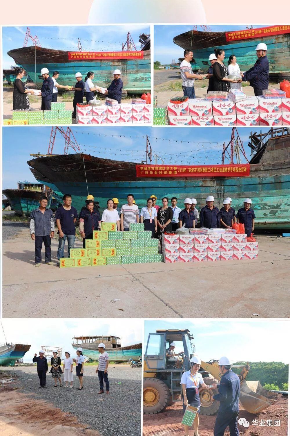 華業(yè)集團(tuán)夏日送清涼活動(dòng)產(chǎn)生了良好的社會(huì)影響,防城區(qū)總工會(huì)聞悉消息后,當(dāng)即決定雙方聯(lián)合組織開展更多的深入工地送清涼活動(dòng),讓更多的在烈日下辛勤工作的工人朋友們得到關(guān)心、愛護(hù)和鼓舞。2018年8月7日下午,防城區(qū)總工會(huì)符皓副主席帶領(lǐng)工會(huì)干部與華業(yè)集團(tuán)工會(huì)鐘麗霞主席一行頂著烈日的熏烤,驅(qū)車前往白龍海邊防碼頭為漁光小鎮(zhèn)項(xiàng)目施工作業(yè)工人送清涼用品,并親切地慰問了工人朋友們,給予深切的關(guān)懷和鼓舞。