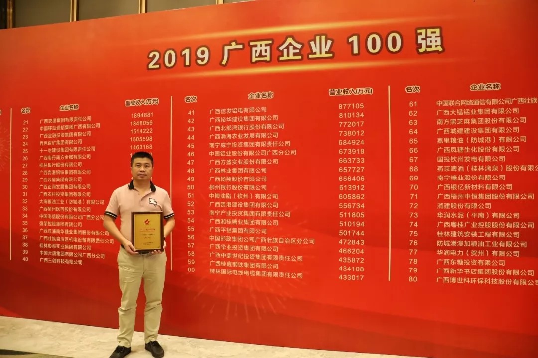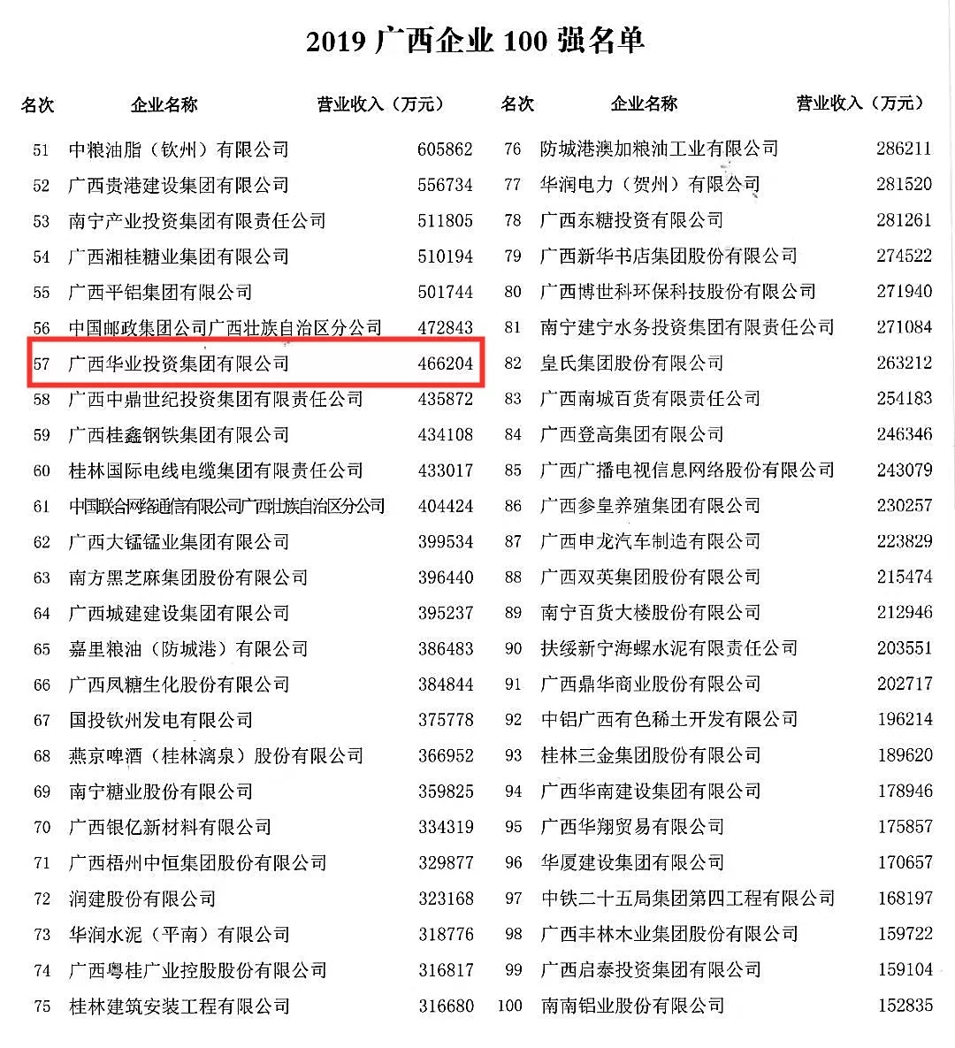 大會發(fā)布了2019年廣西企業(yè)100強等榜單及廣西大企業(yè)發(fā)展主要研究成果。此次評選以2018年企業(yè)營業(yè)收入作為評選標(biāo)準(zhǔn),共有100家實力雄厚的企業(yè)榮登金榜。其中,廣西華業(yè)投資集團有限公司,憑借營業(yè)收入46.6億元,位列廣西百強企業(yè)第57位,連續(xù)兩年榮獲“廣西企業(yè)100強”榮譽稱號!