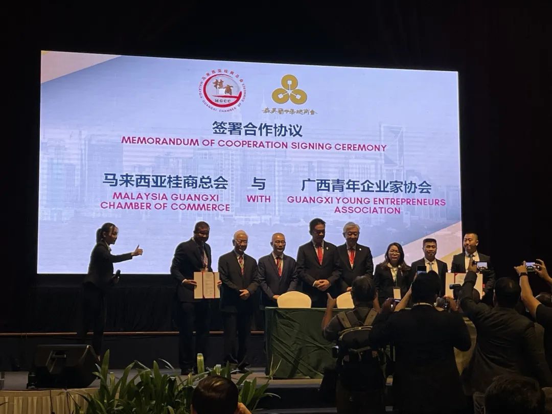 交流會上,廣西青年企業(yè)家協(xié)會常務副會長莫呂斌與大馬桂商總會署理總會長陳拔釗共同簽署合作備忘錄。龍其生會長和拿督呂海庭等人共同見證。