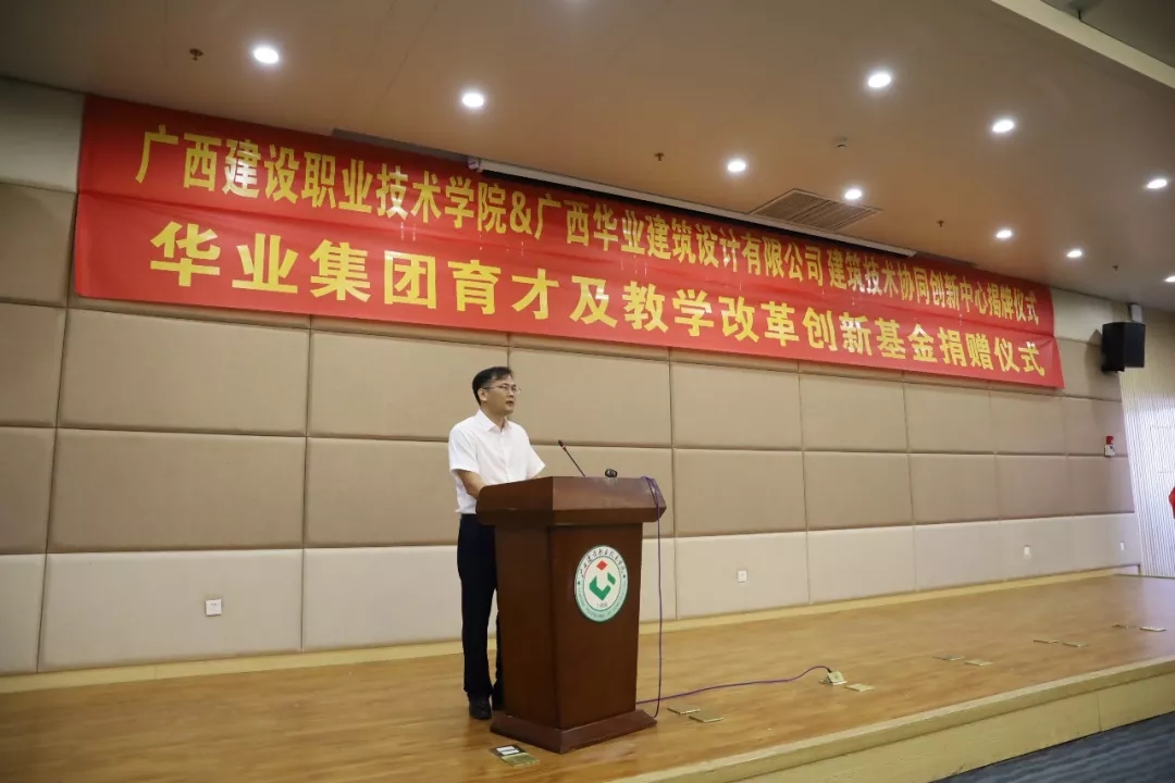 廣西華業(yè)投資集團(tuán)育才及教學(xué)改革創(chuàng)新基金捐贈(zèng)暨廣西建設(shè)職業(yè)技術(shù)學(xué)院&廣西華業(yè)建筑設(shè)計(jì)有限公司建筑技術(shù)協(xié)同創(chuàng)新中心揭牌儀式順利舉行